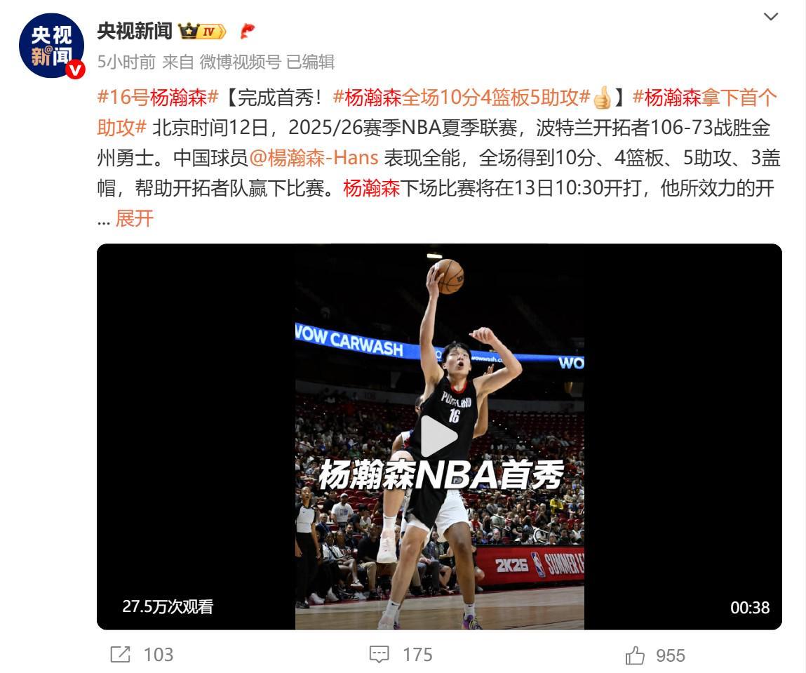 杨瀚森今日完成夏联首秀,新华社、人民日报和央视新闻均转发